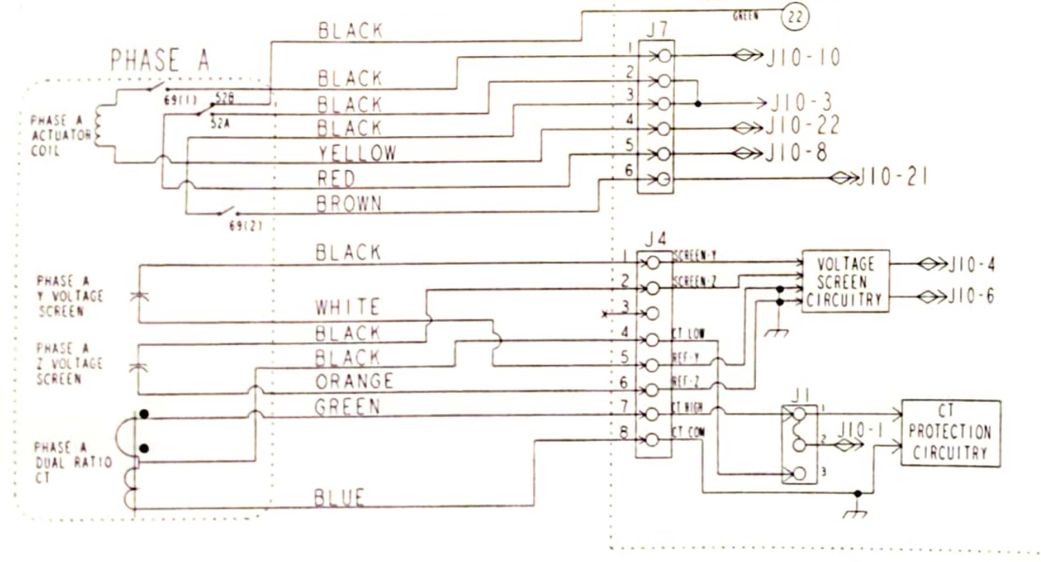 In example, the A-phase CT and control circuits of the G&W Viper-ST with LEA voltage sensors: